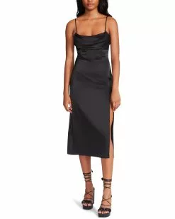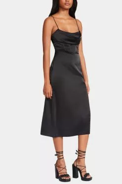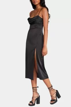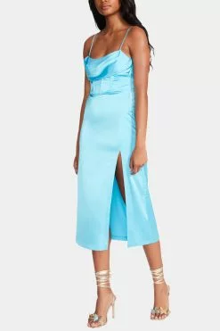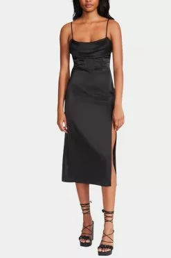 An excellent pick for dinner dates and evening parties, this beautiful midi slip dress features corset detailing, cowl neckline, and deep skirt slit.