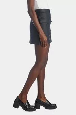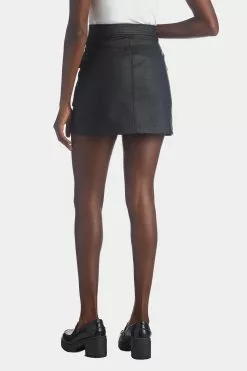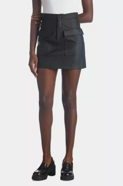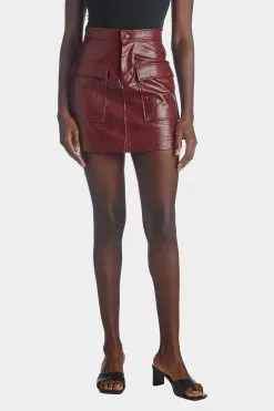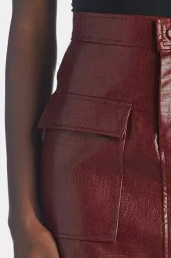 Devon is a bold, closet staple. A croc-embossed, vegan leather skirt with zippered closure and two large front pockets.