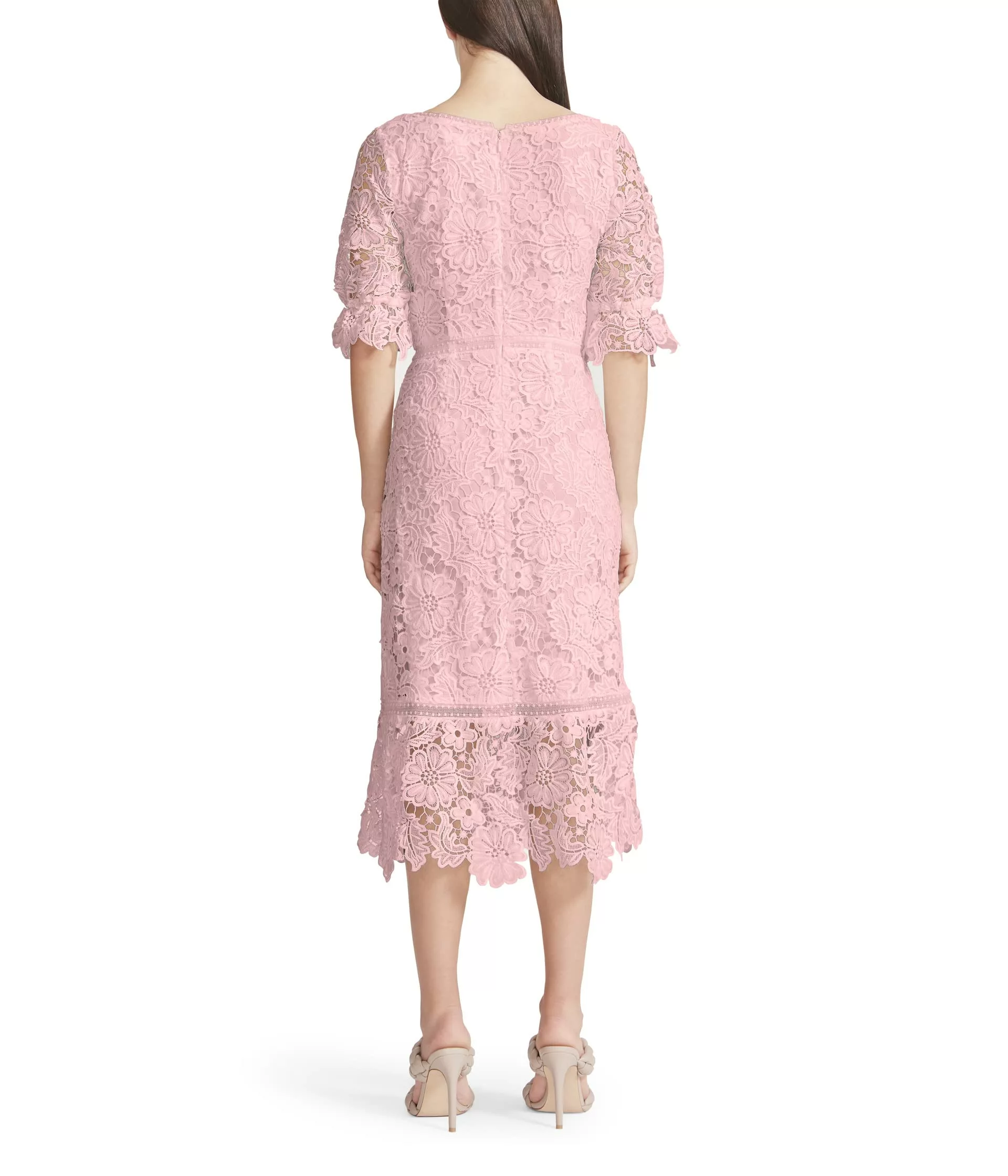 - Three-quarter ruffled lace sleeves with a hidden back-zip closure.