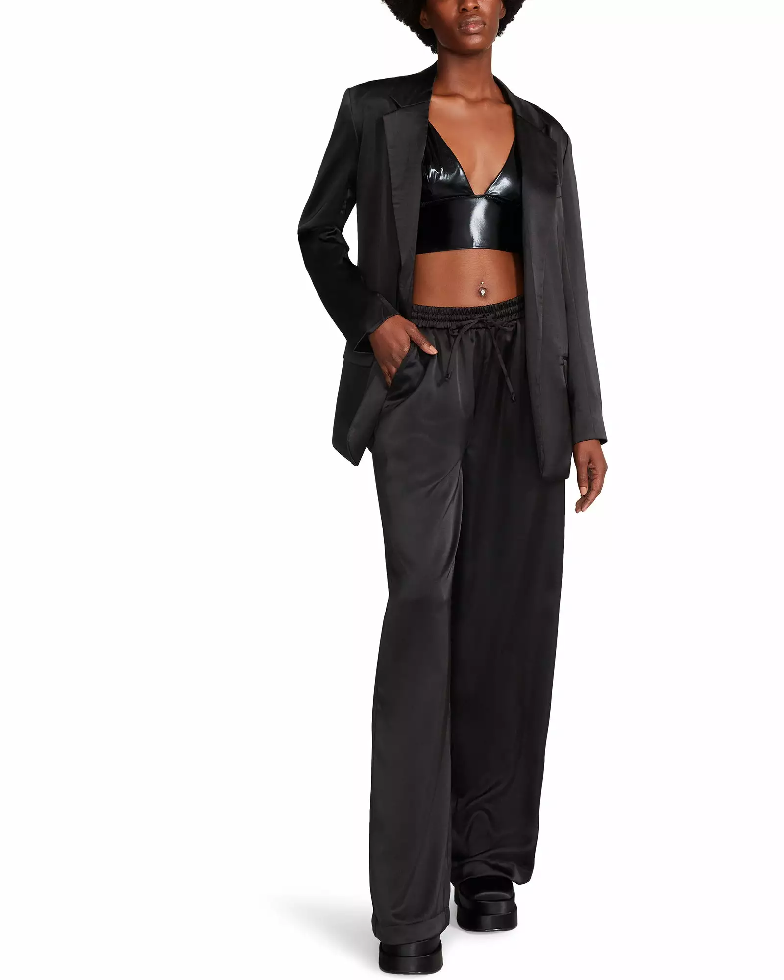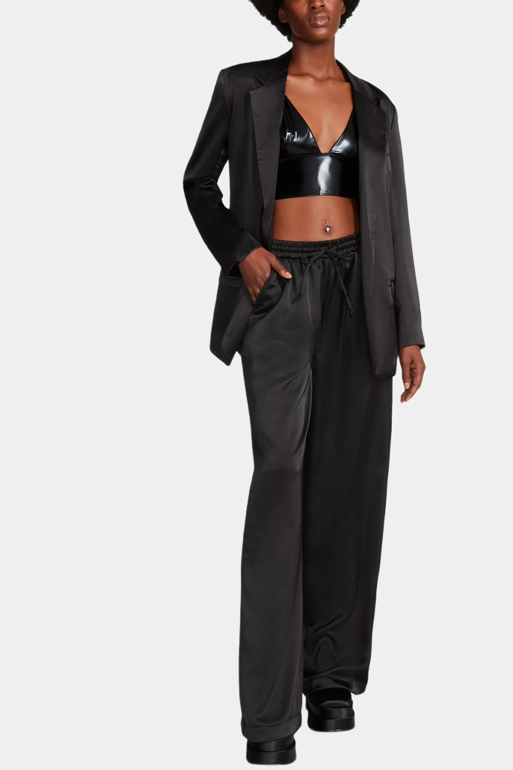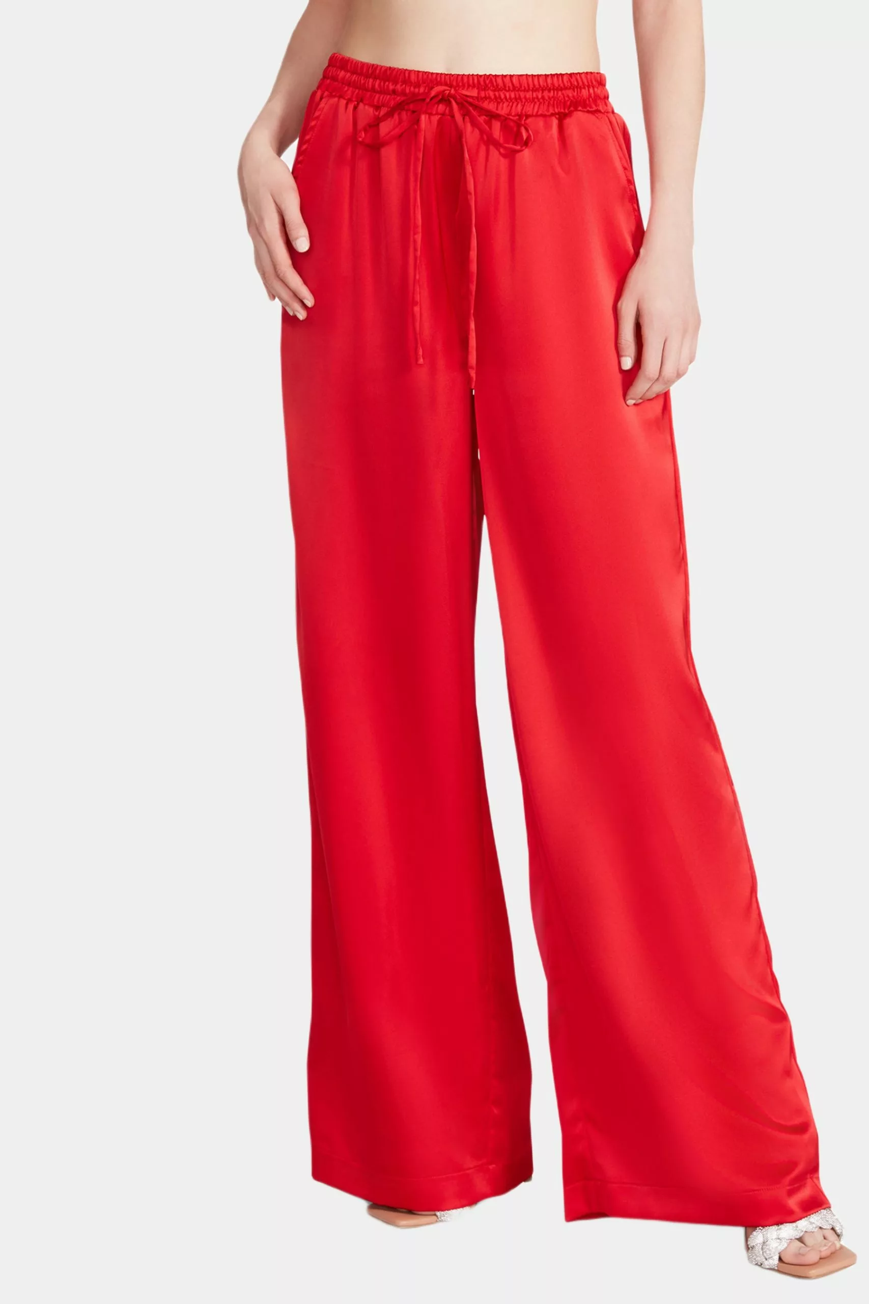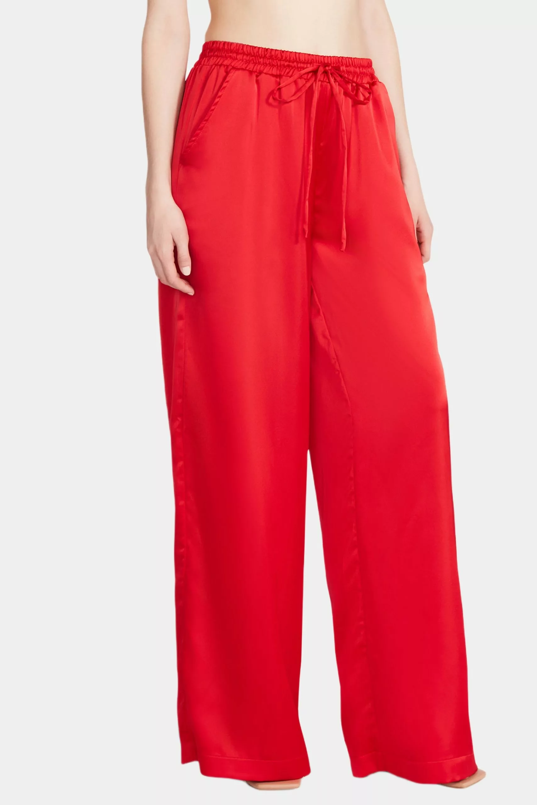 The Dorian Pant is a comfortable, wide-leg, pull-on trouser. She features a drawstring waistband and two invisible side pockets in a satin finish. Pair with a cotton crop top. Pair her with the matching Pepper Bra Top.