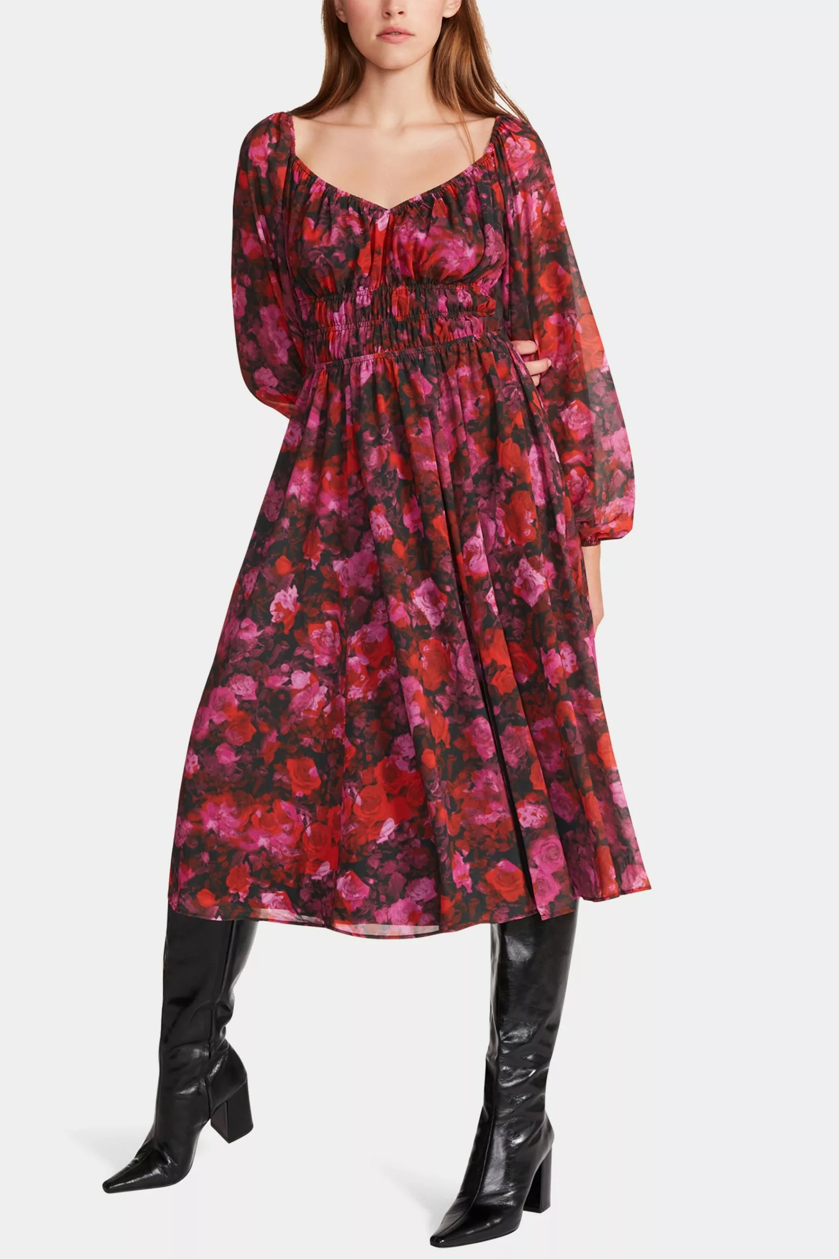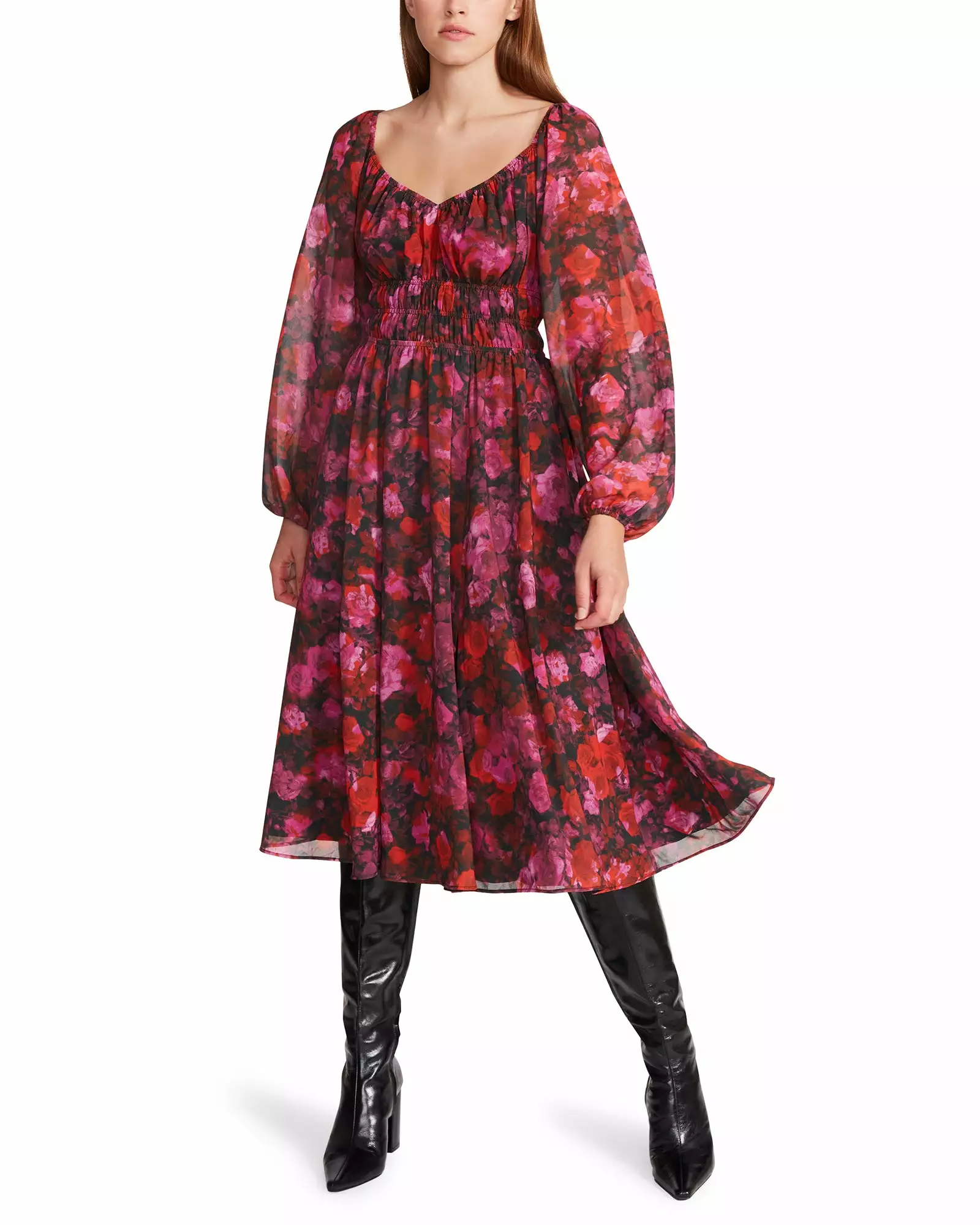 Romance is alive and well. The Laine Dress is a flowy chiffon midi, that features long, voluminous sleeves and sweetheart neckline in a rose floral print.