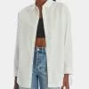 - Front button closure, belt loops