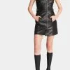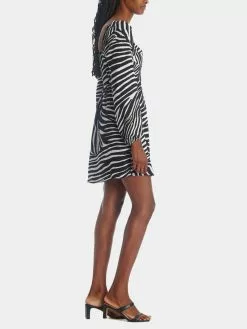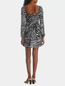 The Nicole is a sophisticated A-line, bustier mini dress in a bold zebra print with a zippered closure.