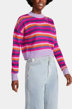 Come for the cozy, stay for the color. The Reggie Sweater is a striped pullover with a mock-neck collar and long drop-shoulder sleeves.