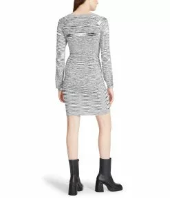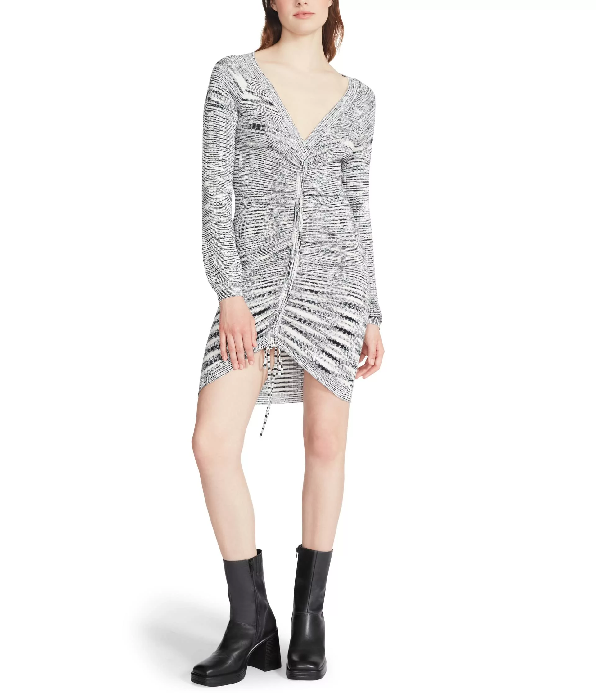 - Space-dye sweater dress with a cinched front.