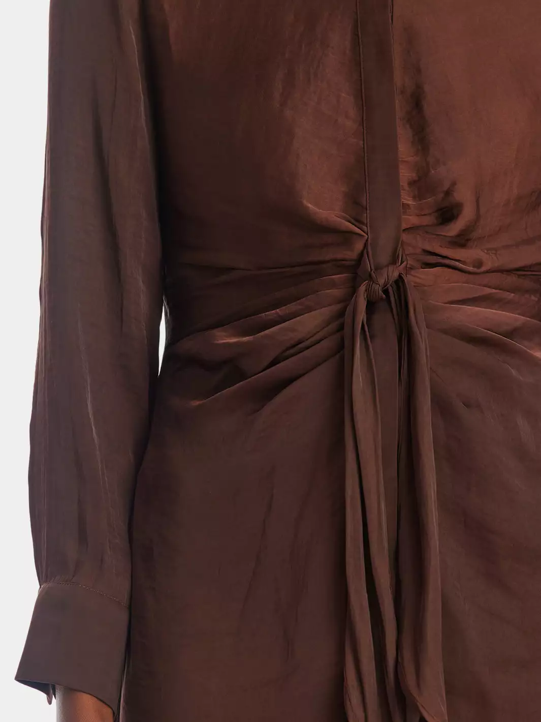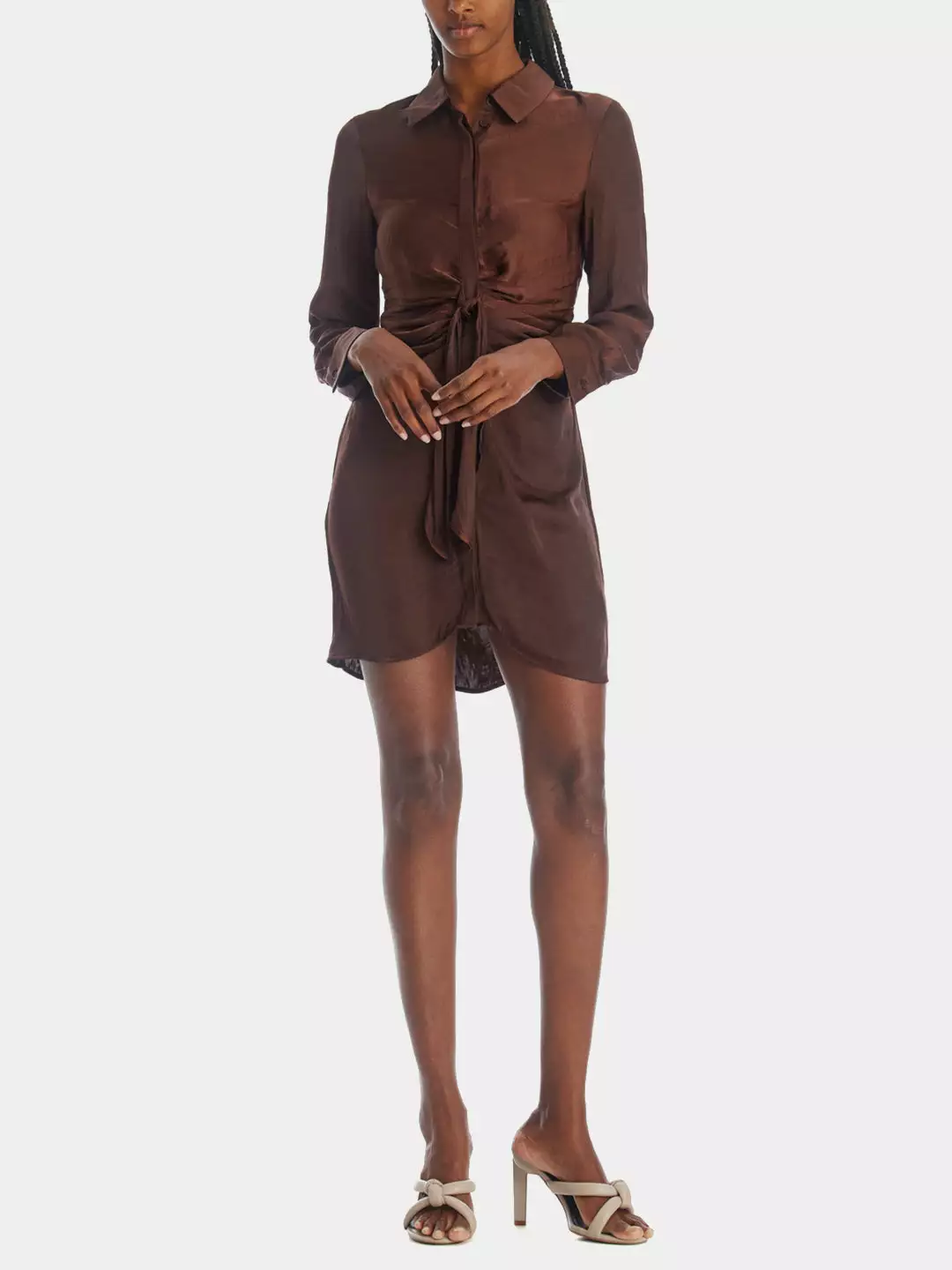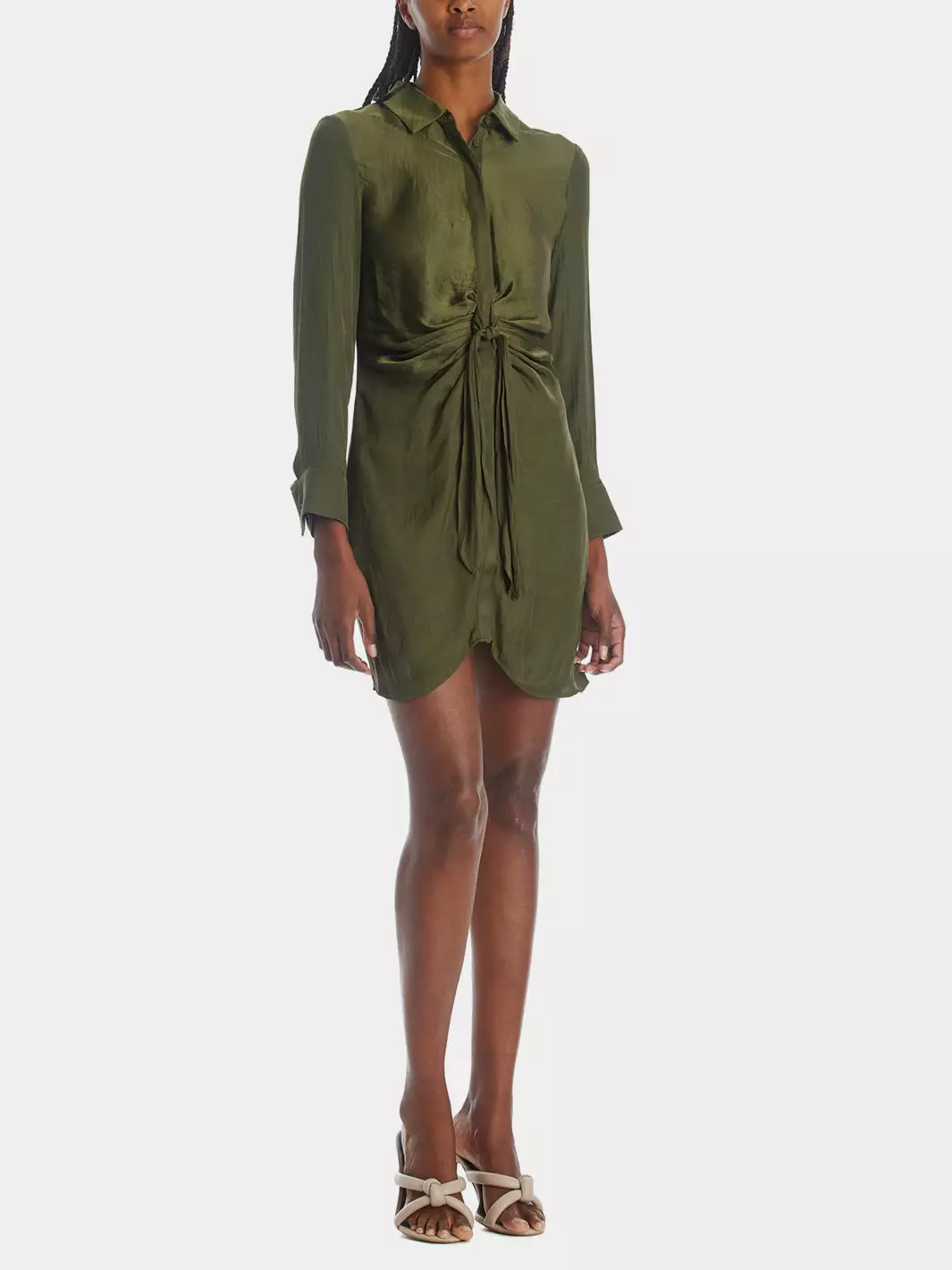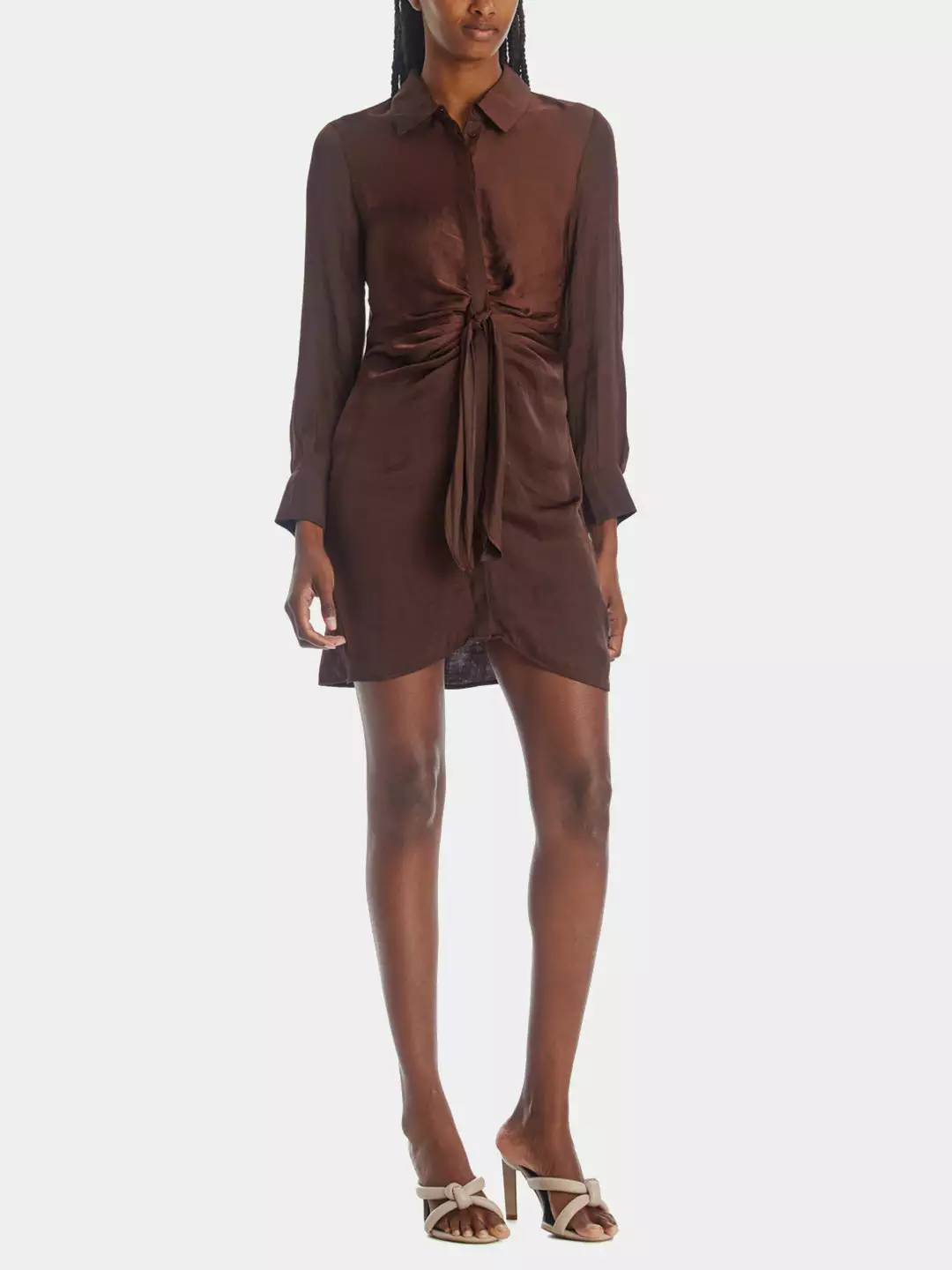 The Tie Curious is a smooth-satin, collared shirt dress featuring a tie-front waist detail, long sleeves, and flirty hemline.