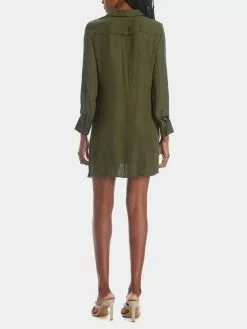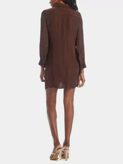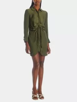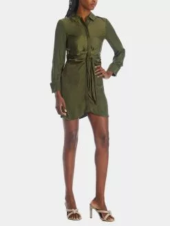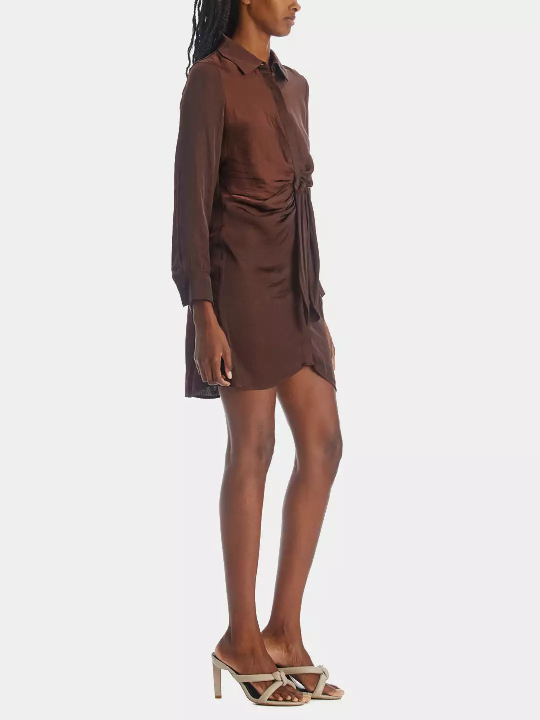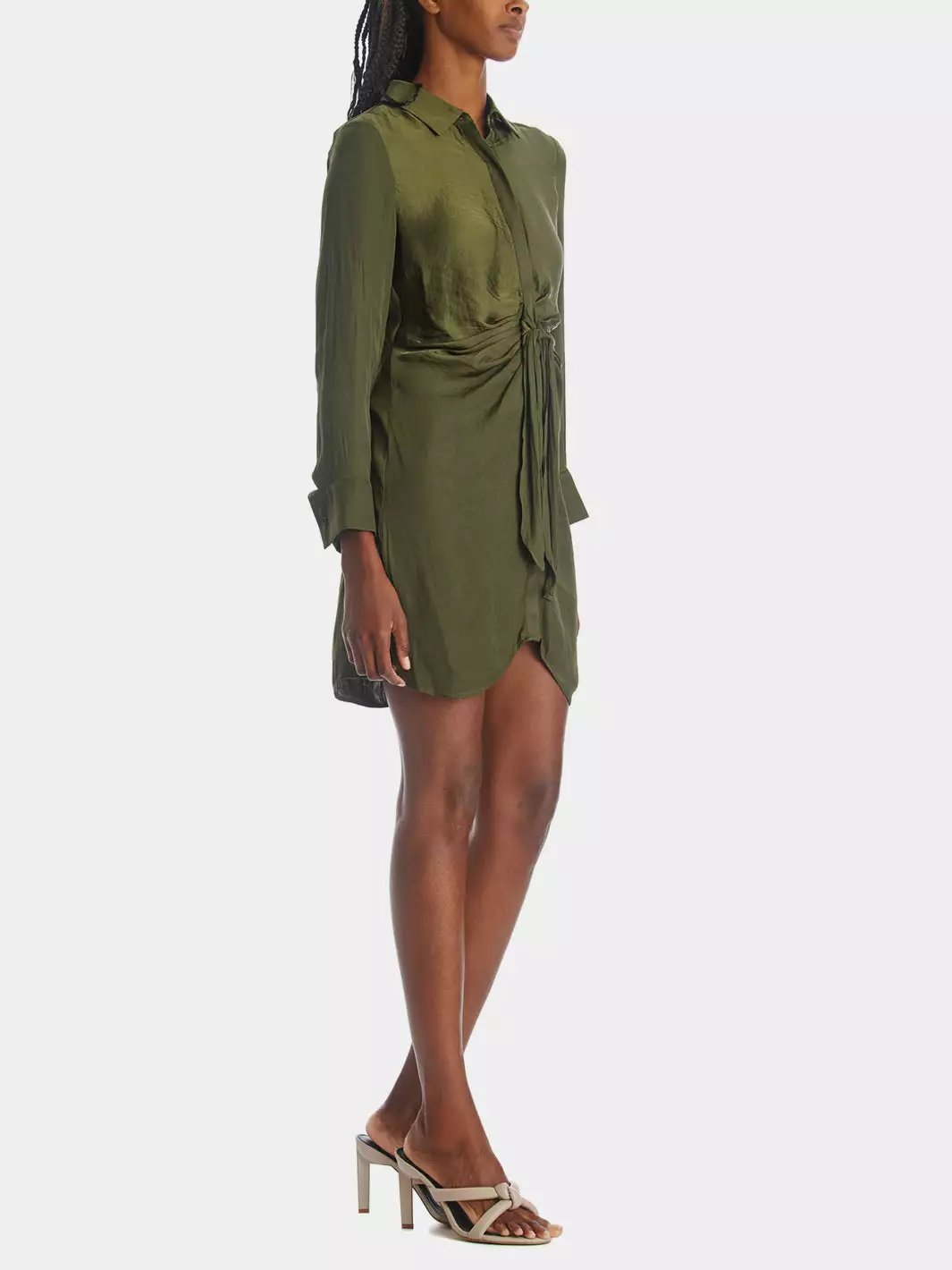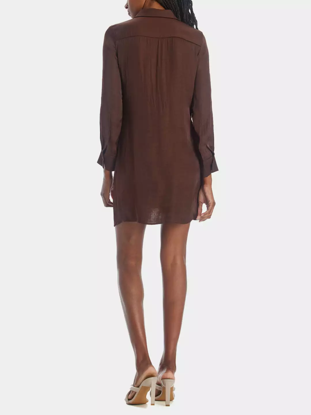 The Tie Curious is a smooth-satin, collared shirt dress featuring a tie-front waist detail, long sleeves, and flirty hemline.